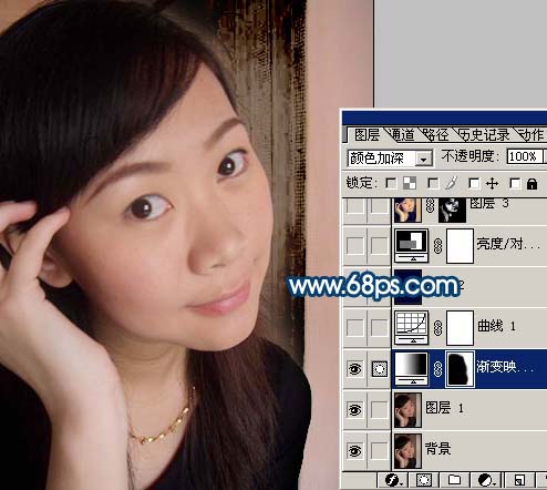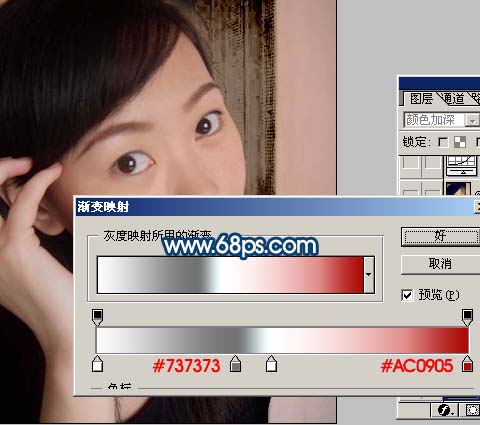 2、創建漸變映射調整圖層,顏色設置如圖1,確定后把圖層混合模式改為“顏色加深”,用黑色畫筆在圖層蒙版上把人物部分擦出來,效果如圖3。