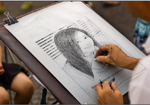教程分兩部來做。先把人物素材轉成素描畫效果。然后再把素描畫放到畫板上去,調整好透視效果,擦掉不需要的部分即可。