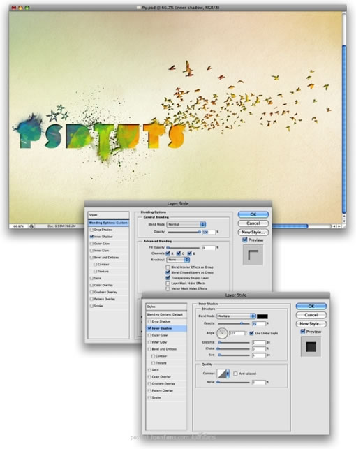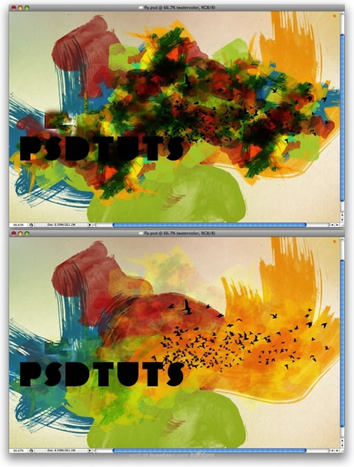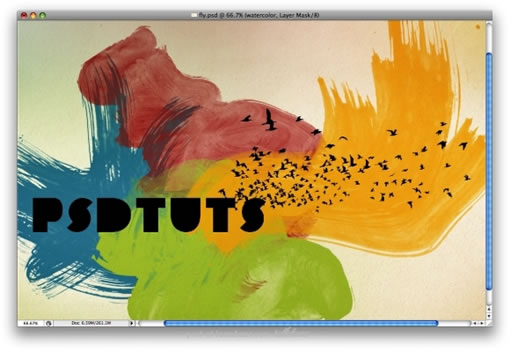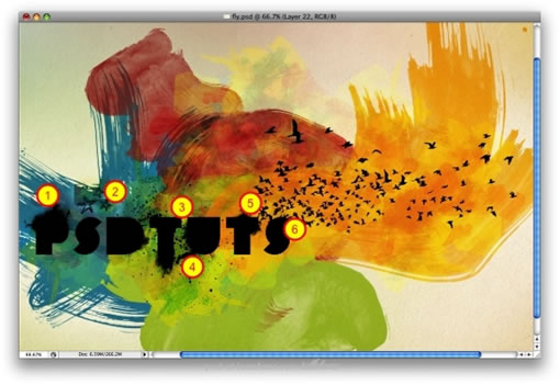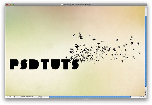 然后打上一些你想好的文字,這里用到的字體是“constructivist”,你也可以用別的你喜歡的字本,但有一點要注意的是,你所用的字體必須是粗體,并且看起來像下圖中的一樣,我還添加了一些鳥類的圖案,你可以用手頭的一些鳥類筆刷來實現(xiàn)相同的效果,或者如果你沒有的話,可以在網(wǎng)上搜索一下下載相應的筆刷。這里主要的一個構思是要讓鳥類圖案看著像是從文字里飛出來的,所以將鳥類的圖案盡量放在“t”和“s”附近。本文是網(wǎng)頁教學www.webjx.com收集整理或者原創(chuàng)內(nèi)容,轉(zhuǎn)載請注明出處!