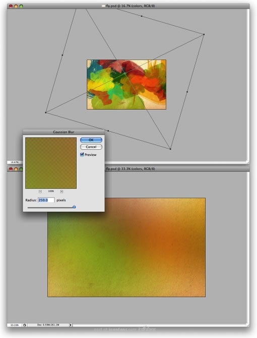 把所有的用"watercolor"筆刷處理好的圖層都放到一個組里去(既“序列”),把這個組復制一個備份,并隱藏掉一個組。然后把顯示的那個組合并掉(ctrl+e)得到一個新圖層,并把它放大一些,放在靠后的圖層位置,繼續(xù)用高斯濾鏡處理(濾鏡-模糊-高斯模糊),填入250的值,完成后將圖層的疊加模式改成疊加。本文由網(wǎng)頁設計webjx.com整理發(fā)布!轉(zhuǎn)載請注明出處,謝謝!