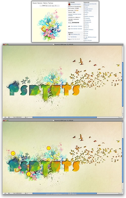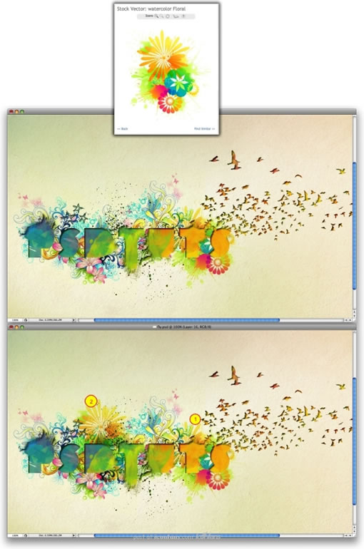 let's add more vector elements, i used another image from istockphoto, this time of floral elements. place the new image in your design and repeat the same thing as the previous step. this time let's use just two copies.