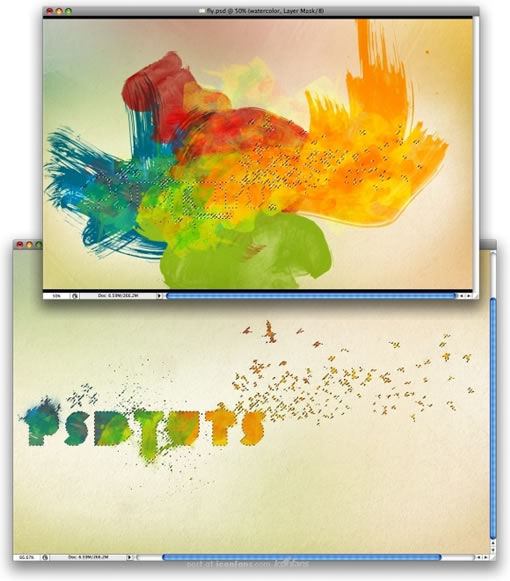 merge the layers with the text, the birds and the brushes with the splatters and other details. go to the layer palette, then hold down the command key and click on the thumbnail of the layer you have just merged. that will create a marquee selection, as in the image below. now select the "watercolor" group and go to layer > layer mask > reveal selection.