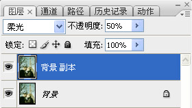 4、復制圖層,并將副本層的混合模式改為“柔光”,不透明度設為“50%”。
