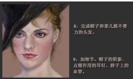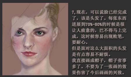 7、現在,可以說臉部已經完成了,該是頭發了。每張東西進展到70% - 80%的時候是很讓人疲憊的,巴不得馬上完成,這時候容易出現敗筆,要耐心,大師面對這么大面積的頭發是有點容易不耐煩。我直接畫成帽子。
