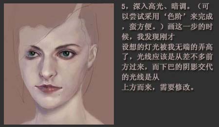 5、深入高光、暗調。可以嘗試采用色階來完成。畫這一步的時候,我發現剛才設想的燈光被我無端的弄高了,光線應該是從差不多前方過來,而下巴的陰影交代的光線是從上方而來,需要修改。