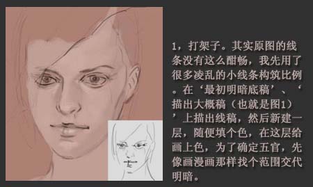 1、打架子,其實原圖的線條沒有這么酣暢,我先用了很多凌亂的小線條構筑比例。在最初明暗底稿描出大概稿,然后新建一層,隨便填個色,在這層給畫上色,為了確定五官,先像畫漫畫那樣找個范圍交代明暗。