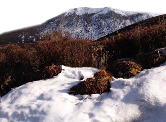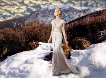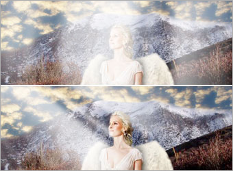 步驟 2、創建 750 x 550px 畫布,導入雪山素材,并使用柔角橡皮擦工具將雪山頂上的天空擦除。