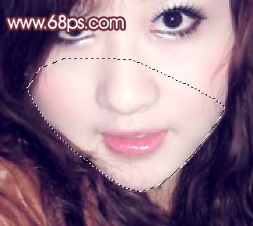 7、新建一個圖層,蓋印圖層,把人物臉部局部放大,然后用鋼筆工具勾出左臉部分,轉為選區如圖11,然后用吸管吸取頭發部分膚色顏色,用畫筆透明度為:10%,在有頭發的地方輕輕點幾下,消除臉上雜亂的頭發,效果如圖12。