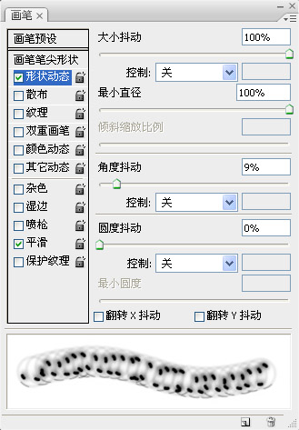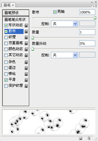 步驟 14:編輯 >> 自定義筆刷。現在就可以在筆刷選框中找到我們制作的氣泡筆刷了。選擇自定義筆刷,將前景色設為“白色”,并按下圖設置。