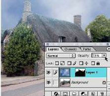 在你使用粘貼模式時,photoshop自動產生了一個新的圖層。這好似把云彩放到了與照片不同的地方。你調整云彩時,對原來的照片沒有絲毫影響。當你滿意了,可以合并圖層,保存圖像。