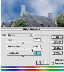 如果仍對色彩不滿意,那么你可以在圖像菜單中adjust選項的下一級子菜單中選擇hue/saturation(色調/飽和度)。直接拉扯滑動條就行了。不斷調試,爭取獲得最自然的色彩。