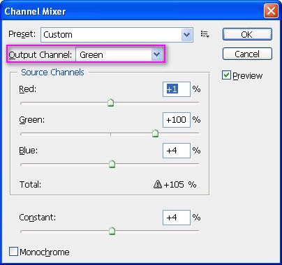 2.如果您是第一次使用這個工具,我要解釋更多信息。正如你所知,照片是基于三個主要的顏色( rgb彩色模式) :紅色,綠色和藍色。隨著通道混合器工具,您可以單獨的調整這些原始顏色。請注意,在選擇通道混合器,您會看到有3個選項中的相應的3個主要的顏色輸出通道下拉框中。您也可以看到,每個主色,滑塊的顏色將永遠被設定為100 % ,默認情況下。例如,當您選擇紅輸出通道,可以看見紅色的滑桿是100 % (而藍色和綠色是0 % ) 。而且把這些滑塊向左或向右,你可以增加或減少顏色的數量在相應的輸出通道。