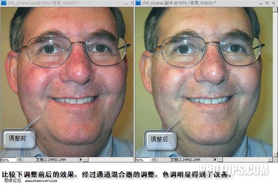3、比較下調整前后的效果,經過通道混合器的調整,色調明顯得到了改善。