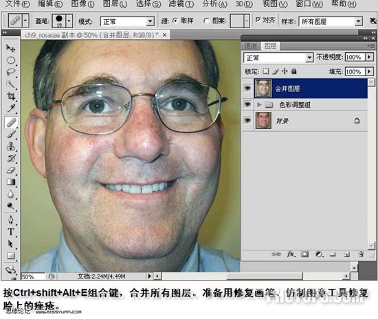 7、新建一個圖層,按ctrl + shift + alt + e蓋印圖層,選擇修復畫筆、仿制圖章工具修復臉上的斑點。