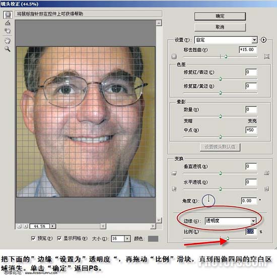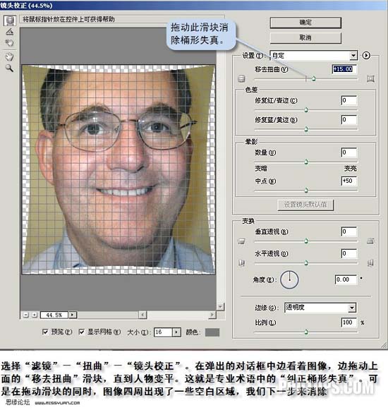 11、選擇菜單:濾鏡 > 扭曲 > 校正鏡頭。在彈出的對話框中邊看著圖像,邊拖動上面移去扭曲直到人物變平。這就是專業術語中的糾正桶形失真。可是再拖動滑塊的同時,圖像四周出現了一些空白區域,我們下一步來消除。