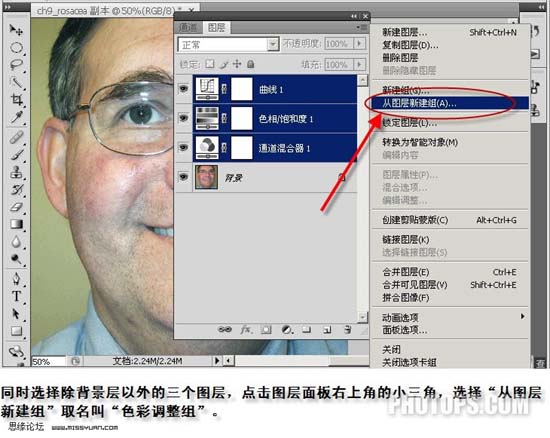 6、同時選擇除背景層以外的三個圖層次,點擊圖層面板右上角的小三角,選擇從圖層新建組取名叫色彩調整組。