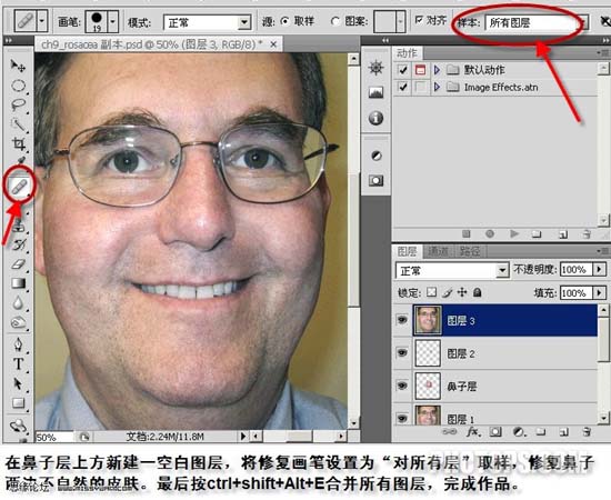 15、在鼻子層上方新建一個空白圖層,將修復畫筆設置為“對所有層”取樣。修復鼻子兩邊不自然的皮膚。最后蓋印圖層所有圖層,完成最終效果。