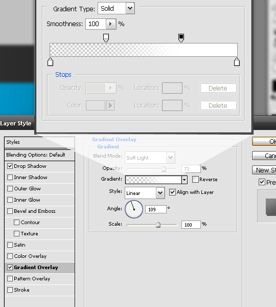 現(xiàn)在我們要給方框加上gradient overlay,選擇layer > layer style > gradient overlay,然后使用如下設(shè)置。