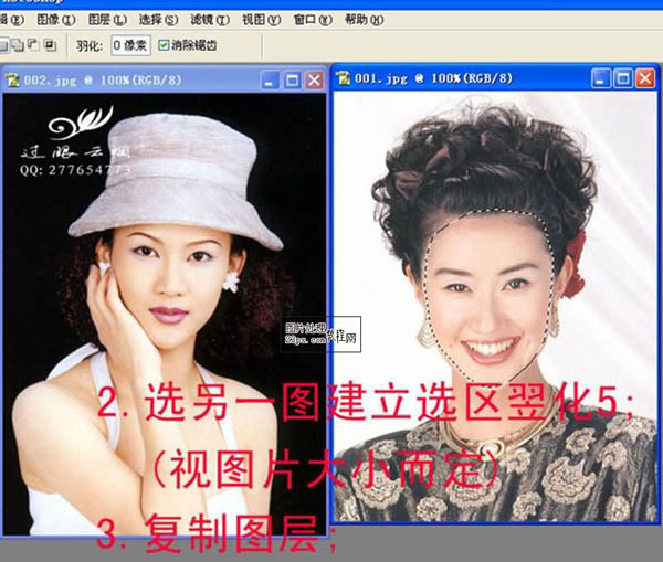 2、選擇素材圖片,同樣勾出她的臉形,適當羽化;ctrl+j將選區內的臉復制出來,ctrl+a全選,ctrl+c復制這一圖層。