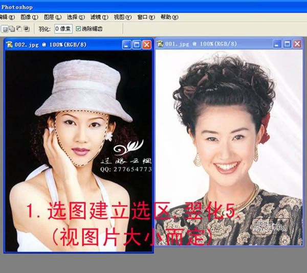 1、打開原圖,用索套或其它選擇工具在原圖上勾出人物的基本臉形,建立選區,適當羽化。