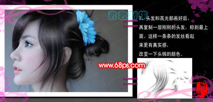 仿手繪的教程有很多,大致思路基本相同。重點是在細節及光感的處理上,如眼睛部分及發絲部分,需要一定的真本事。作者這方面處理的非常細膩,值得學習。