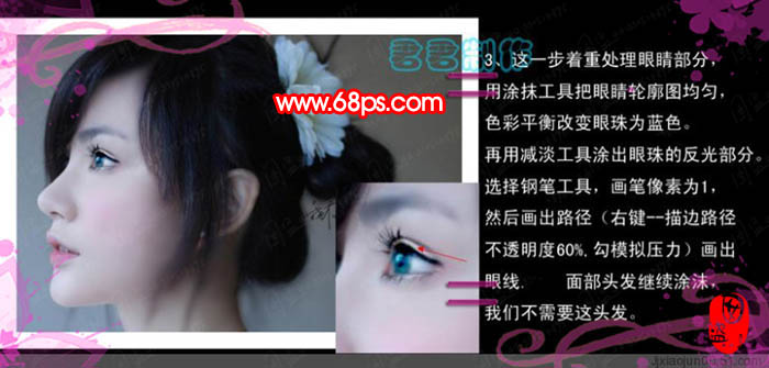 3、這一步著重處理眼睛部分,用涂抹工具把眼睛輪廓涂均勻。用套索工具把眼珠選取出來,按ctrl + b調成藍色。再用減淡工具涂出眼珠的反光部分,選擇畫筆工具大小設為1像素,選擇鋼筆工具勾出眼線的路徑,右鍵選擇描邊路徑,不透明度60%,勾選模擬壓力,畫出眼線,然后把面部頭發涂掉。看到此信息請您諒解!webjxcom為了防采集加上的!請到網頁設計瀏覽更多信息。