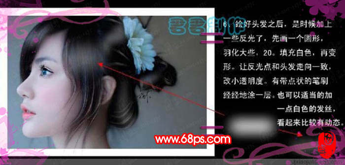6、會好頭發之后,是時候加上一些反光。先畫一個圓形。羽化大些20左右,填充白色。再變形,讓反光點和頭發走向一致,改小透明度,用帶點狀的筆刷輕輕的涂一層,也可以適當加一點白色的發絲,看起來比較有動態。看到此信息請您諒解!webjxcom為了防采集加上的!請到網頁設計瀏覽更多信息。