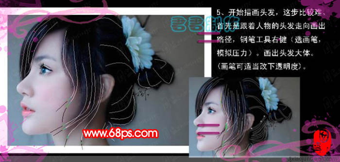 5、開始描畫頭發,這步比較難,首先是跟著人物的頭發走向畫出路徑,然后右鍵選擇描邊路徑,勾選模擬壓力。畫出頭發大體。