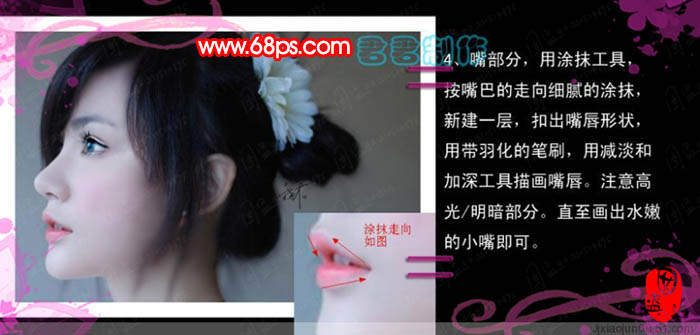 4、嘴部分處理。用涂抹工具按嘴巴的走向細膩的涂抹,用鋼筆工具摳出嘴唇形狀,轉為選區后,適當的羽化一下,然后復制,新建一個圖層,粘貼進來,選擇減淡/加深工具涂出嘴唇的高光和暗調,效果如下圖。
