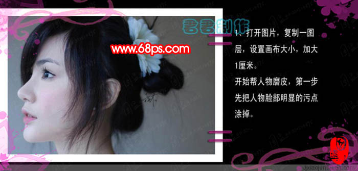 1、打開原圖素材,按ctrl + j把背景圖層復制一層,再執行:圖像 > 畫布大小,把高和寬度加大1厘米。然后開始磨皮,先把人物來那不明顯的污點涂掉。