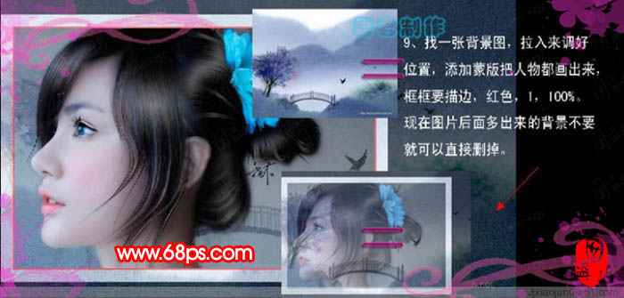 8、找一張背景圖,拖進來,調整好位置,加上圖層蒙版用黑色畫筆把人物部分涂出來。然后再給圖片加上一個紅色邊框線。本信息代表文章來源網頁教學webjx.com請大家去www.webjxcom瀏覽!