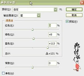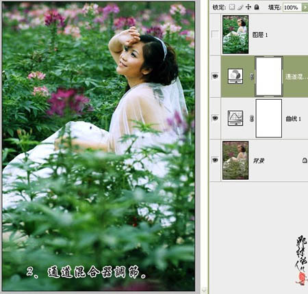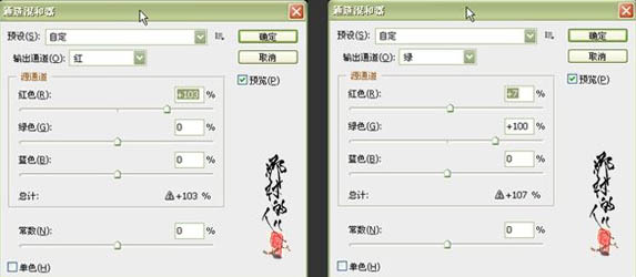 2、創(chuàng)建通道混合器調(diào)整圖層,對個顏色進行調(diào)整,參數(shù)及效果如下圖。