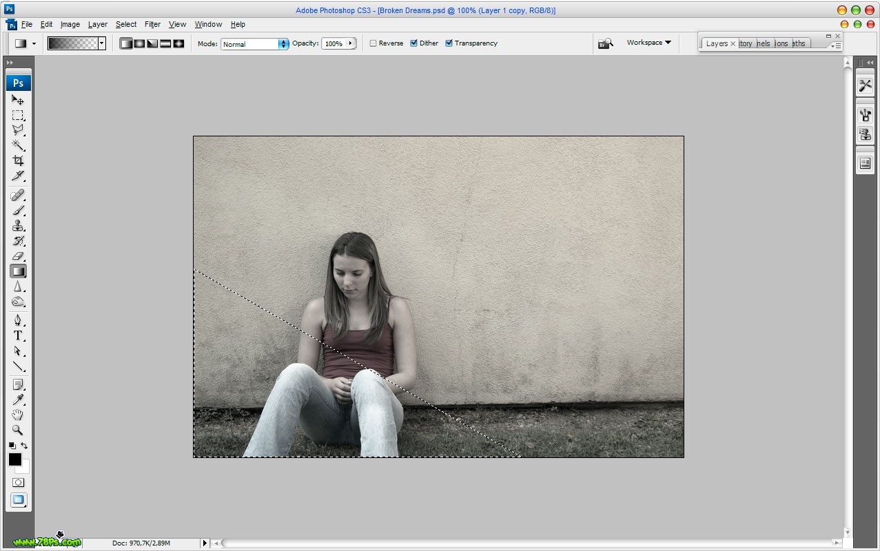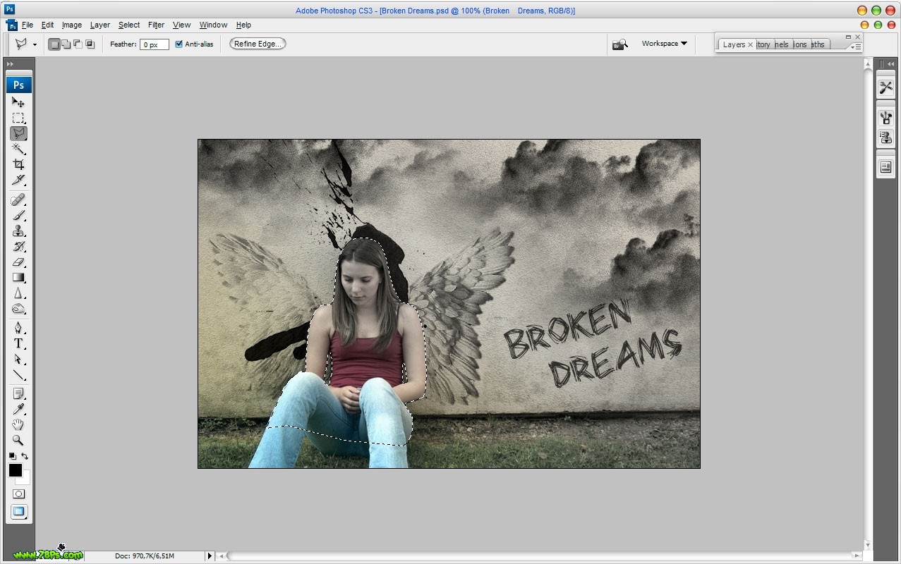 5.現(xiàn)在合并所有筆刷圖層,按ctrl+e向下合并。把女孩摳出來(可以用磁性套索、鋼筆工具),按del鍵刪除那些遮住女孩的筆刷效果。