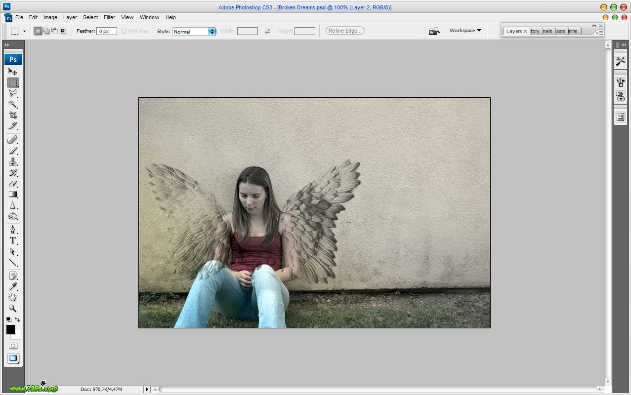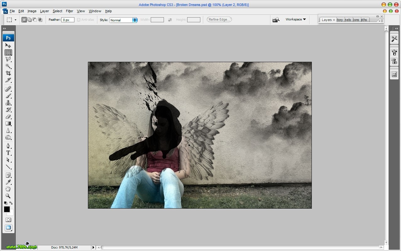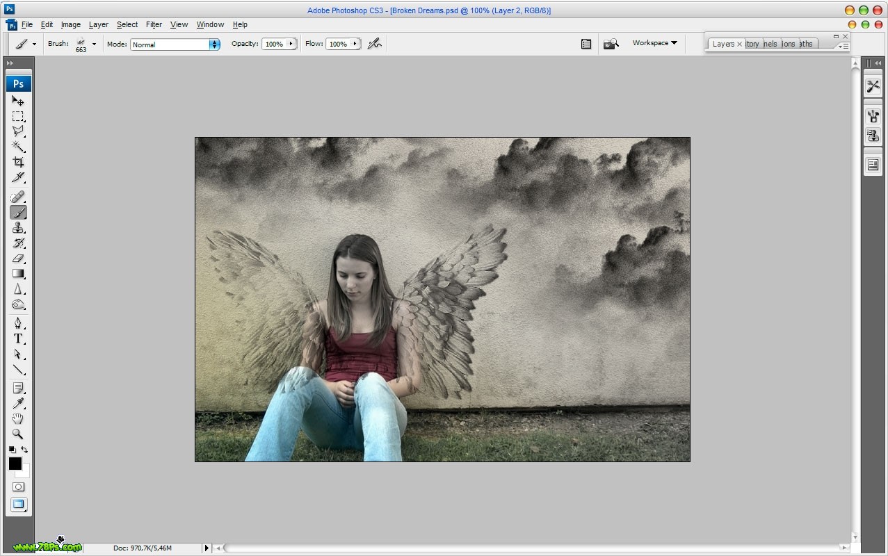 設(shè)置畫筆的顏色為黑色,用畫筆工具添加一對翅膀在女孩上在新建的圖層上(按shift+ctrl+n)