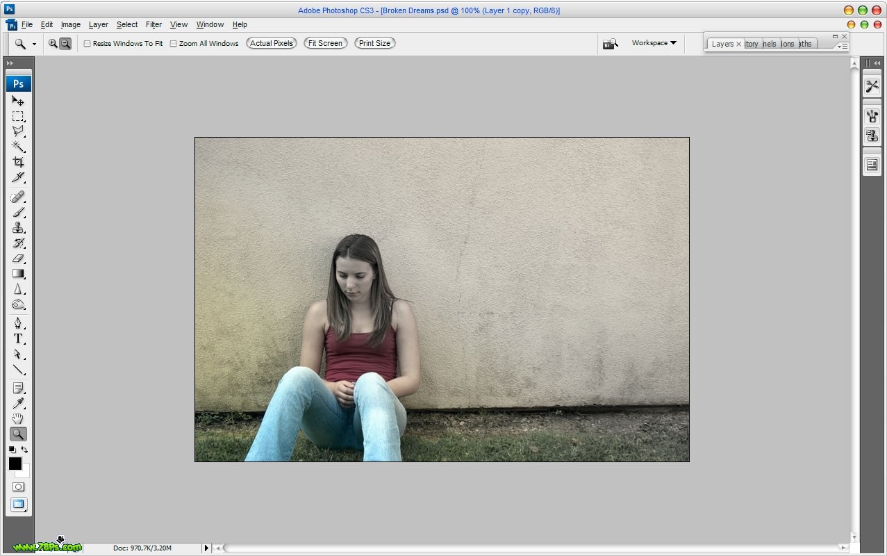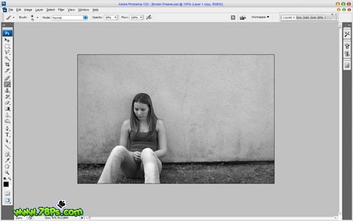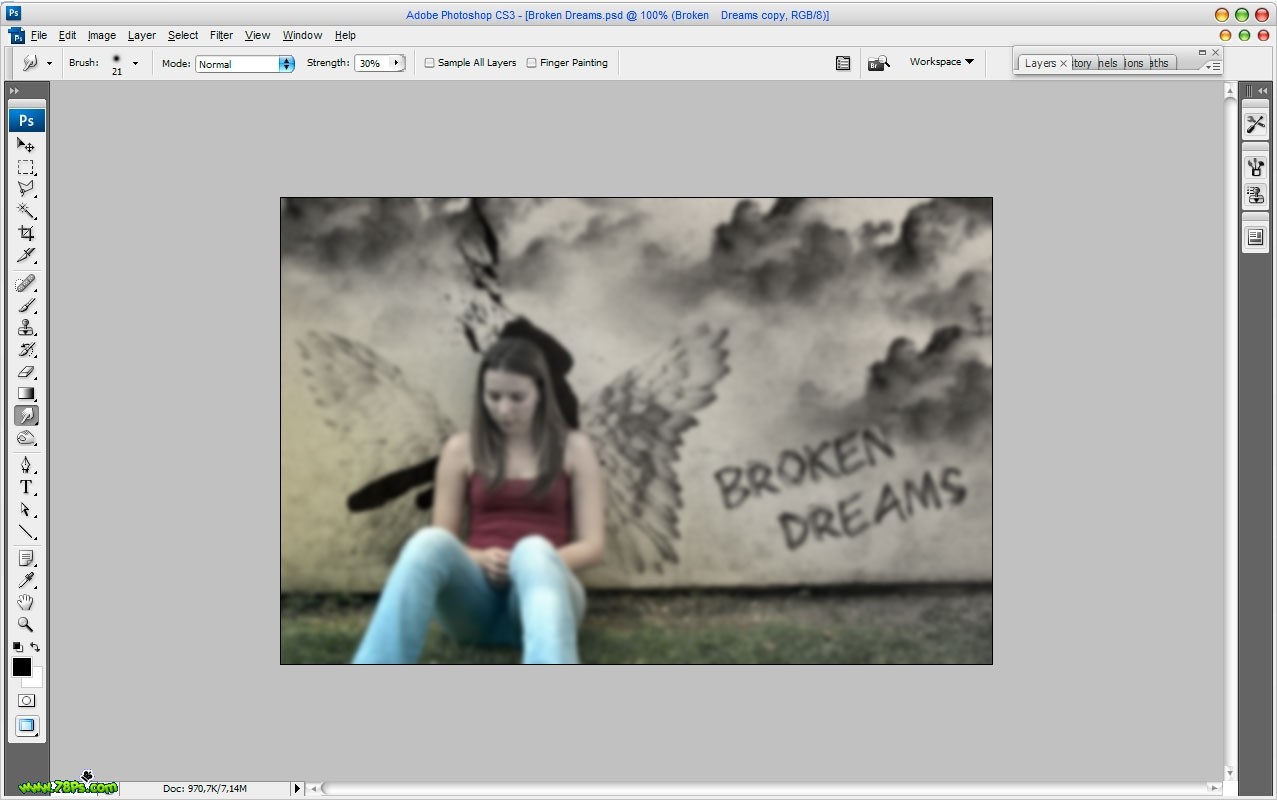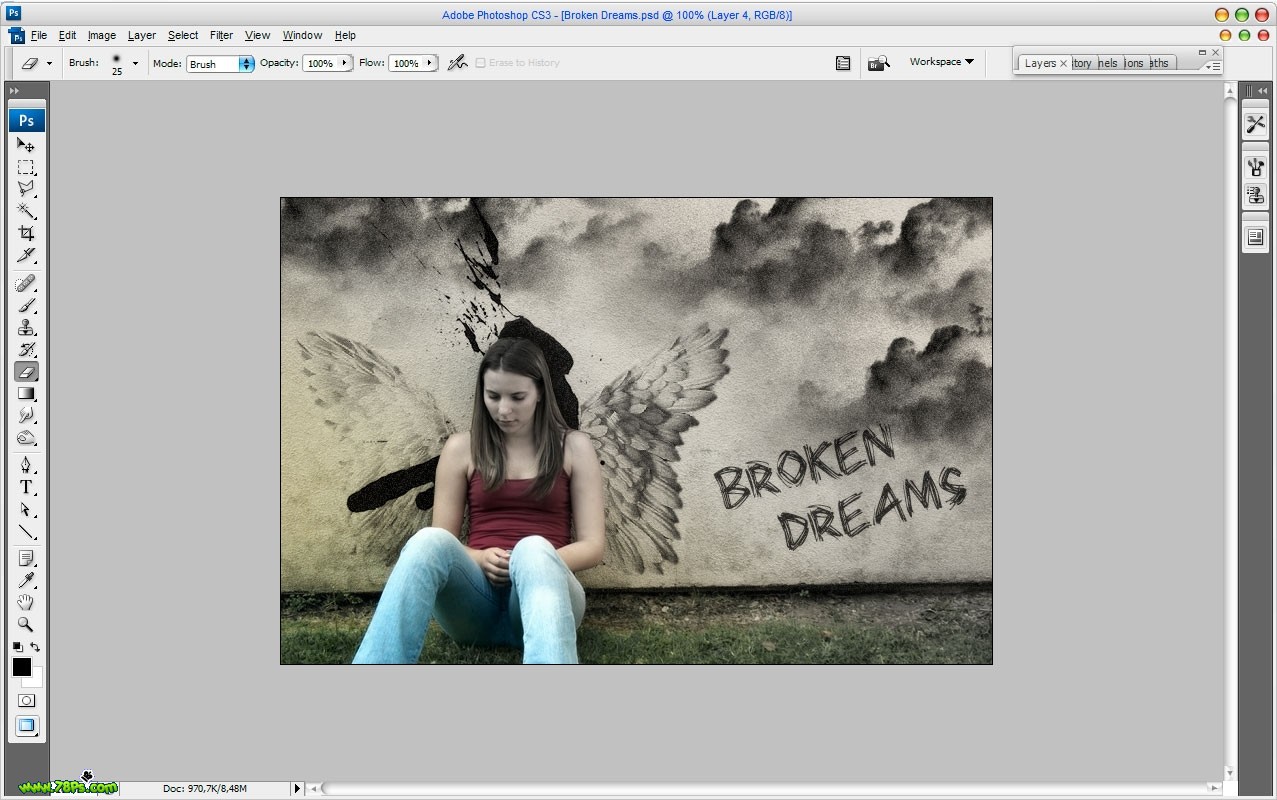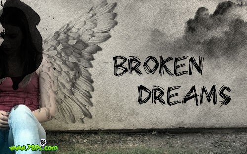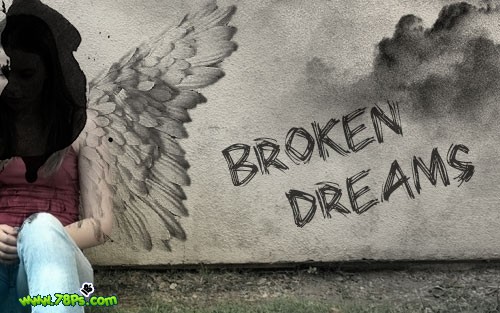 4.我們現(xiàn)在應(yīng)該添加一些文字。選擇文件工具,字體為bearpaw,大小80pt,顏色黑色。在墻壁上輸入broken dreams,你也可以輸入你喜歡的英文。