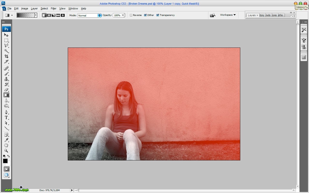 2.把復(fù)制層的不透明度改為80%,然后按q進(jìn)入快速蒙版,用漸變工具(線性漸變、黑色到透明)拉一個如圖的漸變