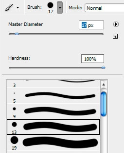 5.完成輪廓后。我們要添加一些元素。設(shè)置前景色為#ff3c00,選擇畫筆工具,選中如圖的筆刷(17px,100%)