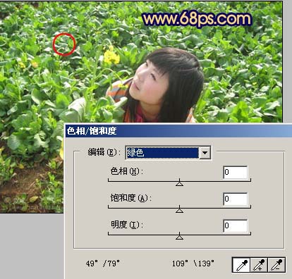1、打開原圖素材,創建色相/飽和度調整圖層,選擇綠色,然后用吸管在圖片中吸取菜葉的綠色,如圖1紅圈位置,吸取后調整參數,如圖2,效果如圖3。