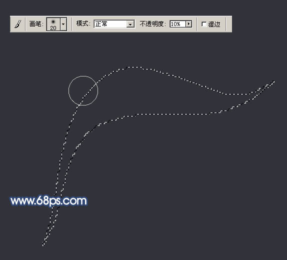 2、按ctrl + enter轉(zhuǎn)為選區(qū)后,適當(dāng)把選區(qū)局部放大,然后選擇畫筆工具,選擇柔邊的圓形畫筆,不透明度設(shè)為:10%,如下圖,然后開始慢慢涂抹選區(qū)的上部分,涂抹的時(shí)候手要穩(wěn),盡量貼近選區(qū)涂抹,先用大的畫筆涂抹大色塊,再用小的畫筆涂抹邊緣高亮的部分。