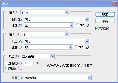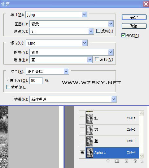 1、打開原圖,執行圖像—計算,兩次,分別得到alpha1和alpha2通道,計算設置如下圖。