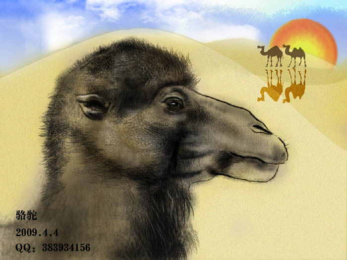 4、然后給畫中的駱駝上顏色,新建一層,把前景顏色設置為:#564627,選擇柔角畫筆工具在駱駝上涂抹。記得不透明度要低一些,在做的過程中shift + {是減少畫筆邊角硬度。shift + }是增加畫筆硬度。然后用鋼筆工具勾出背景沙漠形狀,填充顏色。 |