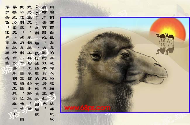8、我們用前面自己定義的畫筆深入刻畫駱駝細節(jié)。這步比較費時,要有耐心。太陽的效果,新建一個圖層填充紅色,按ctrl + j復制一層,執(zhí)行:濾鏡 > 渲染 > 光照效果,再把圖層混合模式改為“強光”。用鋼筆工具勾出裝飾的駱駝,降低不透明度,然后復制一個垂直鏡像,拉長些。圖層混合模式改為“柔光”。然后把白沙用鋼筆工具勾選一下,添加雜色,這樣更有質(zhì)感。 |