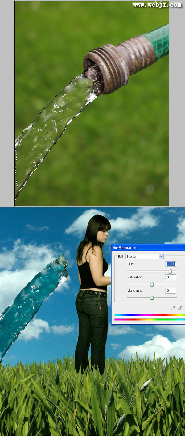 現(xiàn)在讓我們來(lái)創(chuàng)造一些水螺旋。這一次,我們將使水從軟管下降。選中它并粘貼在我們的形象?,F(xiàn)在轉(zhuǎn)到圖像“調(diào)整”色相/飽和度和變化的色調(diào)設(shè)置為111 。