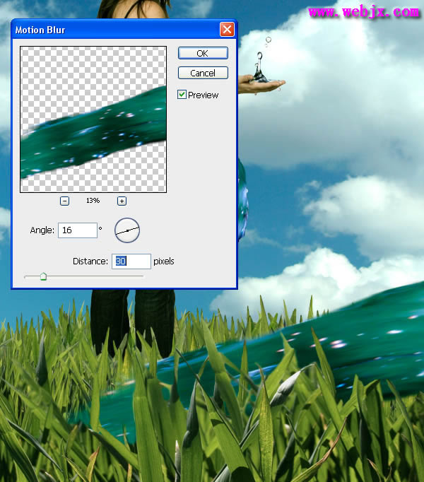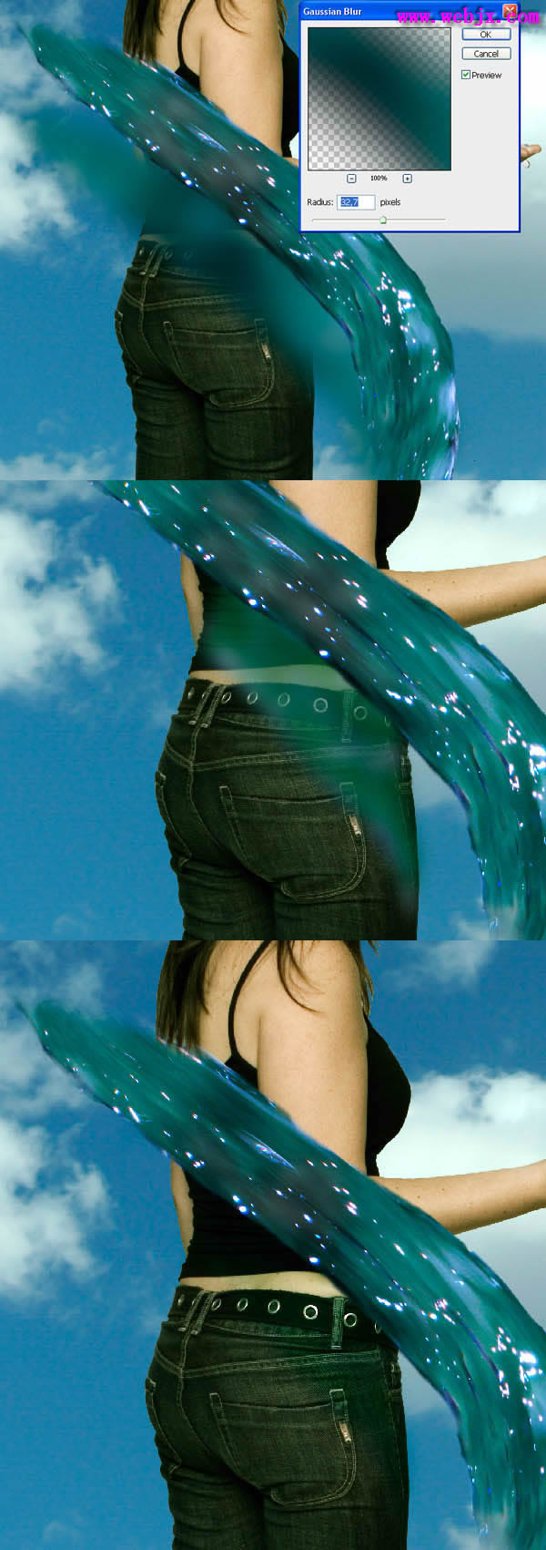 使 水層下移的低,采用高斯模糊半徑為32像素。現(xiàn)在,使用橡皮擦工具在刪除模糊不屬于全身的女孩。添加一些綠色和黃色圖像“調(diào)整”色彩平衡,并最終改變種層由正常的柔和光線。