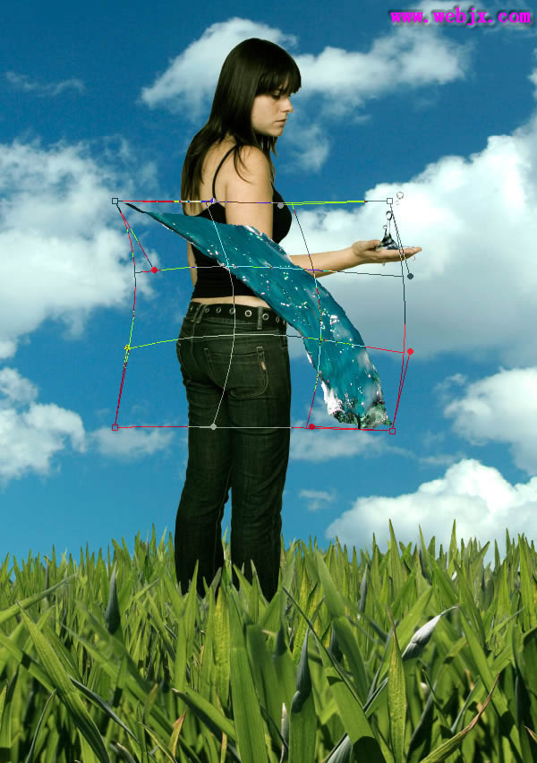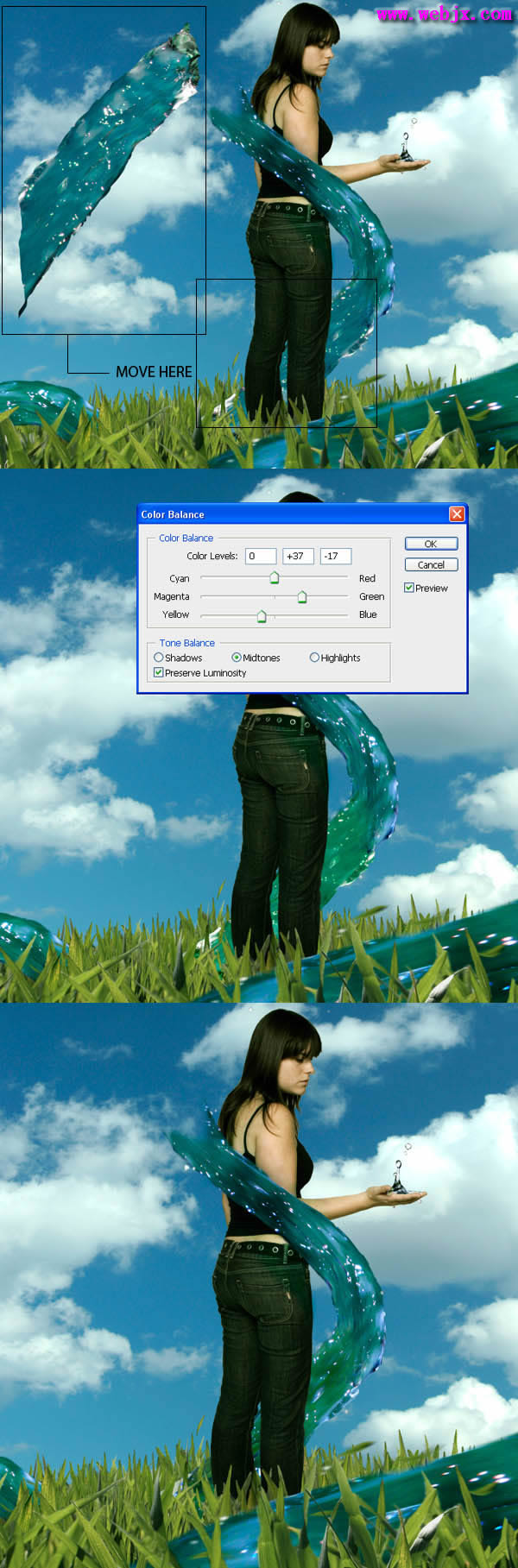 移動(dòng)水層,變形工具使之變形,更加真實(shí),調(diào)整色彩平衡: