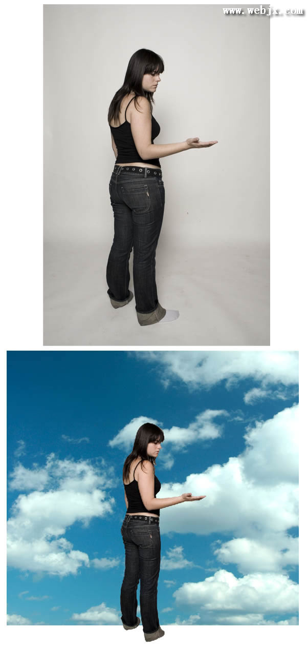 選擇女孩素材,修復(fù)細(xì)節(jié),使之和背景更加配合,右側(cè)的女孩是修復(fù)后的效果: