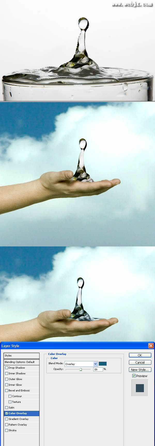 讓我們現(xiàn)在的水滴在手的姑娘。正如你所看到的,我們有很好的形象,這并不需要太多的編輯,以獲得良好的最后期待。剪下并貼到我們的形象背后的女孩層。然后使用顏色疊加圖層樣式選項(xiàng)中(圖層“圖層樣式”顏色覆蓋) ,使藍(lán)綠色色調(diào)的下降。使用覆蓋在混合模式下,選擇一種顏色類似的形象,并設(shè)置不透明度為59 % 。