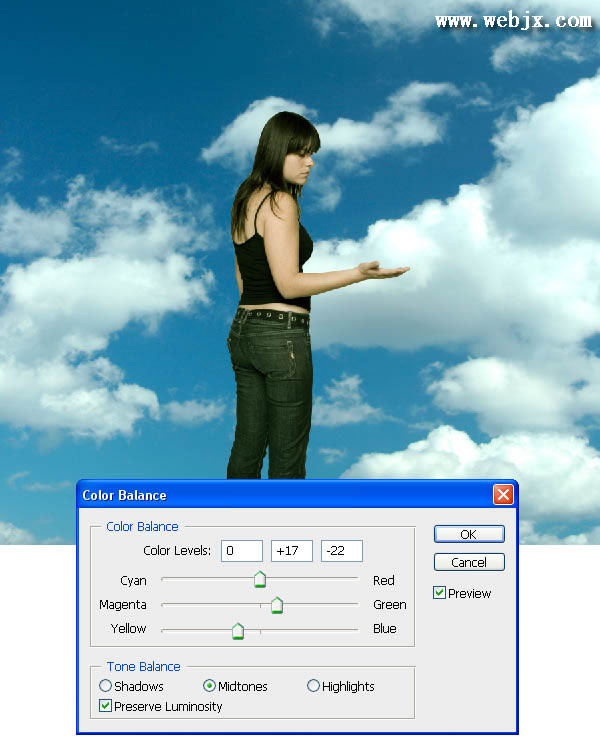 再對(duì)女孩素材進(jìn)行色彩平衡調(diào)整: