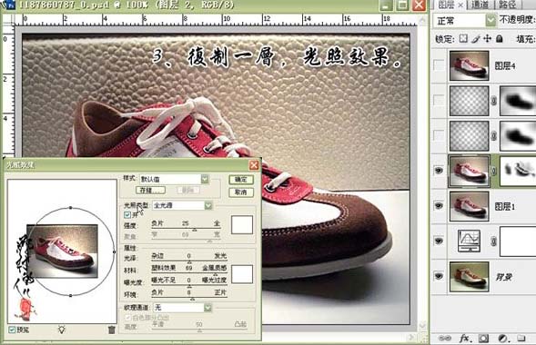 3、把蓋印后圖層復制一份,執行:濾鏡 > 渲染 > 光照效果,參數設置如下圖,加上圖層蒙版用黑色畫筆把鞋子部分擦出來。 |