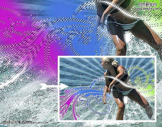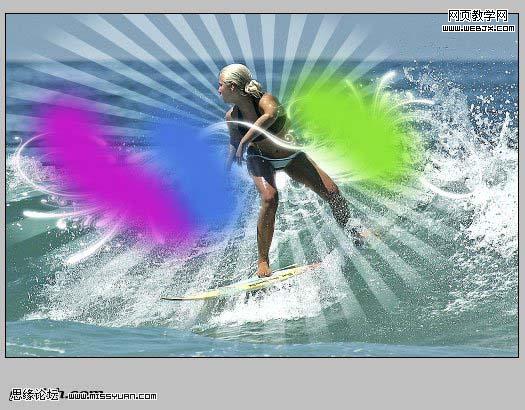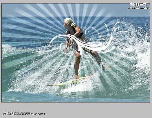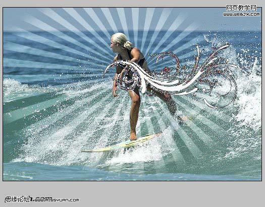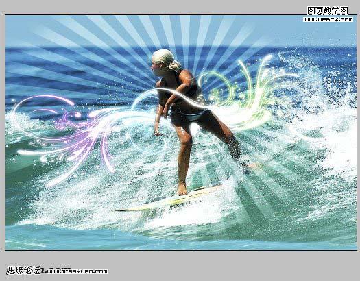 本教程的色調及創意非常不錯。簡單的利用沖浪女孩素材,通過一系列的調色及增加裝飾效果打造出一幅非常出色的效果。制作的過程不多,不過作者的細節及局部裝飾做得很棒,值得學習。